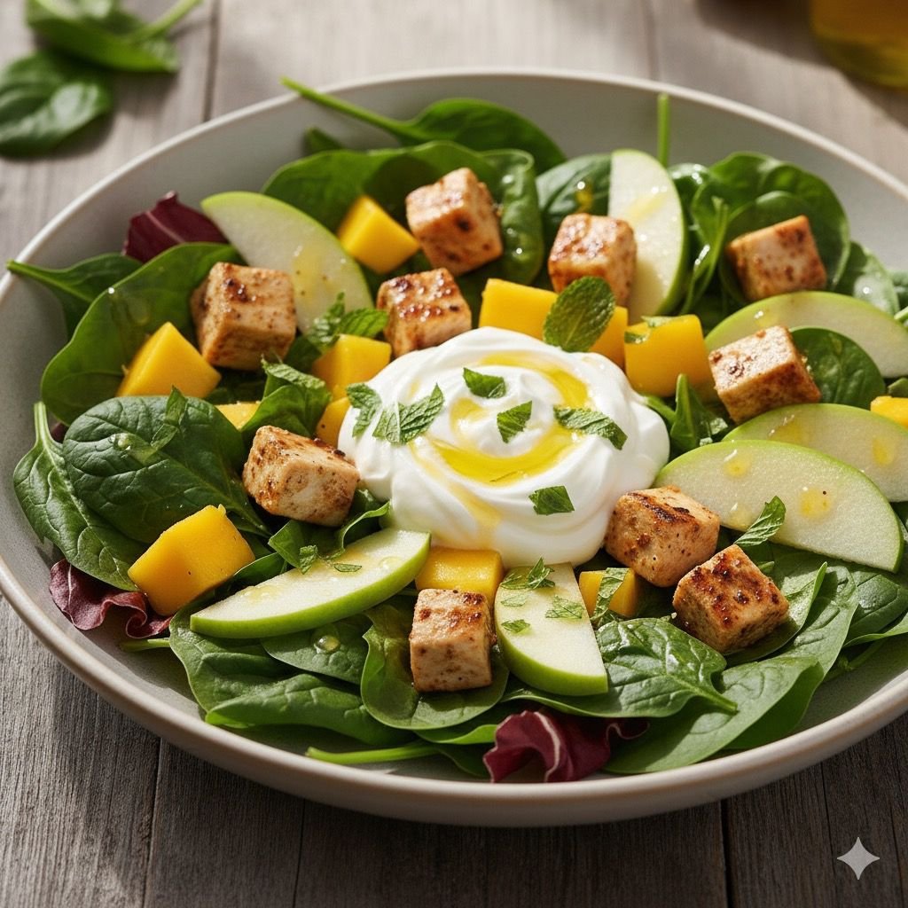 Trocear la manzana y el mango en dados no muy pequeños añadir la ruta a las hojas de ensaladas y reservar. Trocear ahora la pechuga de pollo al curry en lonchas no muy gruesas.