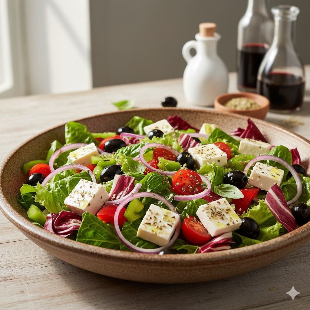 Separar las hojas de lechuga, lavarlas, escurrirlas y trocearlas. Pelar la cebolla y picarla, pelar los tomates y cortarlos en trozos. Cortar el queso en cubos. Colocar todos los ingredientes de la ensalada en un cuenco y sazonar con sal y pimienta.
