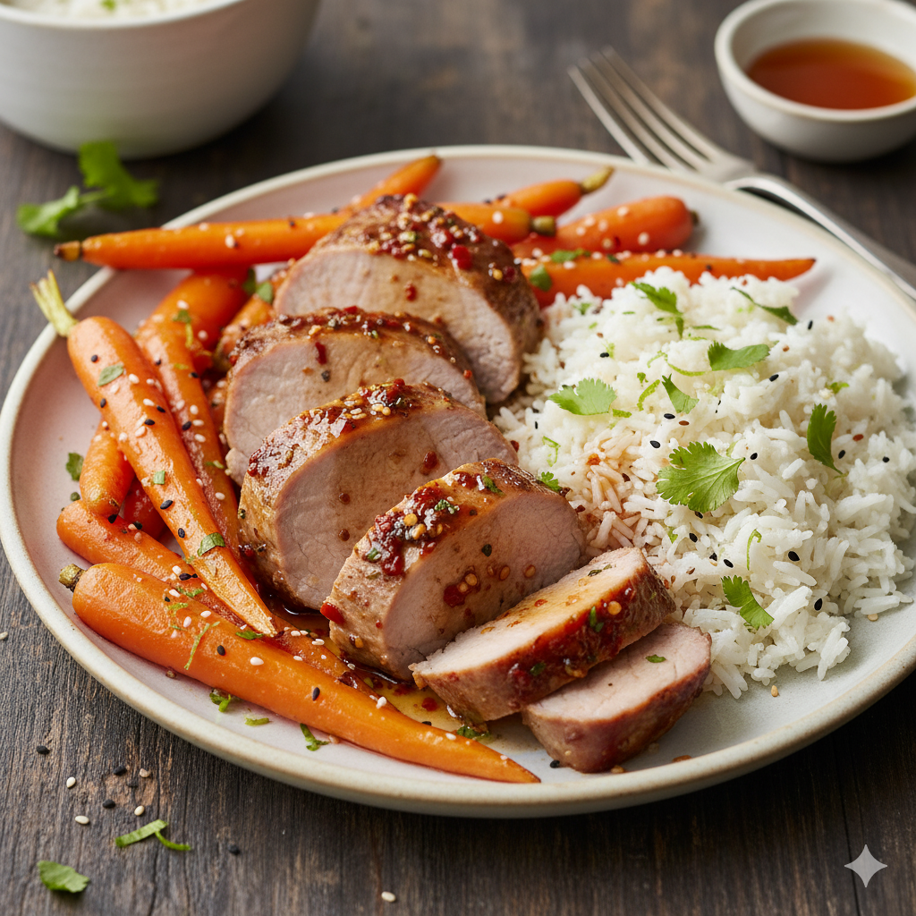Comienza precalentando el horno a 200°C (400°F) y preparando el arroz: pon a hervir el agua con sal, añade el arroz, reduce el fuego al mínimo, tapa y cocina por 15-20 minutos; mientras tanto, mezcla las zanahorias con el aceite de sésamo, sal y pimienta en una bandeja para hornear y ásalas durante 20-25 minutos hasta que estén tiernas, añadiendo las semillas de sésamo en los últimos 5 minutos; simultáneamente, sazona el cerdo con sal y pimienta, séllalo en una sartén apta para horno con aceite de oliva a fuego alto hasta dorar todos sus lados, luego retira del fuego, cúbrelo generosamente con una mezcla hecha de la miel, la salsa picante, el vinagre y el ajo en polvo, y lleva la sartén al horno (junto con las zanahorias si caben) durante unos 15-20 minutos o hasta que el cerdo esté cocido a tu gusto (temperatura interna de unos 63°C), dejándolo reposar 5 minutos antes de cortar; finaliza el plato esponjando el arroz cocido con un tenedor e incorporando la ralladura de lima, el jugo de lima y el cilantro fresco justo antes de servir todo junto.