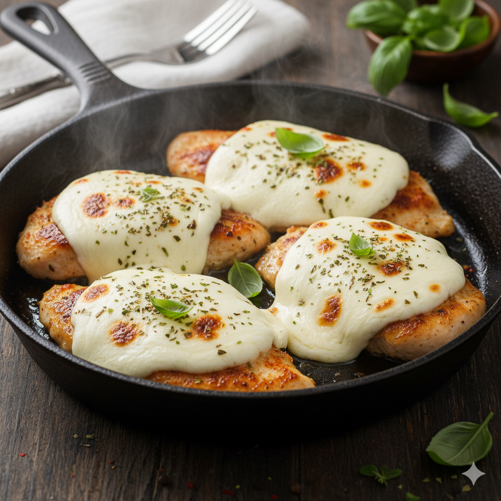 Para preparar este delicioso plato, comienza sazonando generosamente los filetes de pollo por ambos lados con la sal, la pimienta negra, el ajo en polvo, el pimentón (si lo usas) y la mitad de las hierbas secas; luego, calienta el aceite de oliva en una sartén grande a fuego medio-alto y cocina el pollo durante unos 4-6 minutos por cada lado (dependiendo del grosor) hasta que esté dorado y completamente cocido por dentro. Una vez listo, reduce el fuego al mínimo, coloca las rodajas de queso mozzarella sobre cada filete, espolvorea el resto de las hierbas secas sobre el queso y tapa la sartén inmediatamente, dejando que se cocine por unos 2-3 minutos más con el vapor hasta que el queso esté completamente derretido y burbujeante; sírvelo al momento, decorado con hierbas frescas si lo deseas.